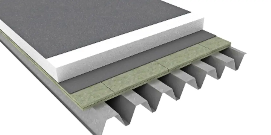 Retvendt varmt tag med mineraluld på underlag af trapezprofilerede stålplader eller beton.